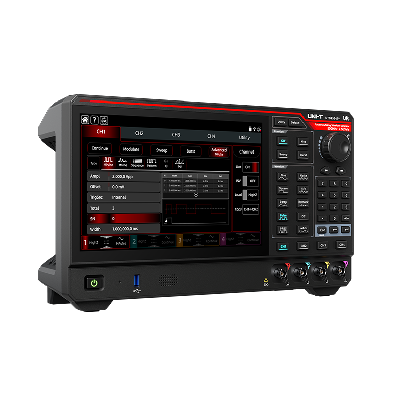 The UTG9000T+ series high-performance, four-channel function generators employ DDS technology to deliver precise, stable, and low-distortion waveforms with fast-rise square wave output. They support comprehensive analog and digital modulation, along with sweep, burst, multi-pulse, and sequence functions. Featuring an intuitive graphical interface and a built-in frequency counter, these versatile instruments enhance efficiency in both educational and testing applications.